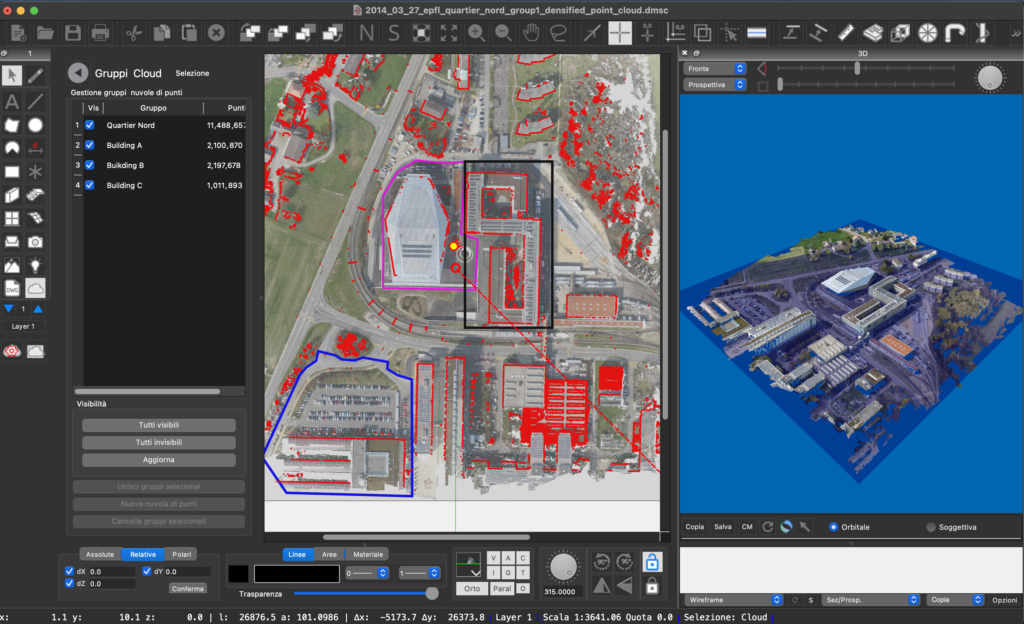 Domus.Cad può organizzare la nuvola di punti in gruppi, in modo che ogni gruppo può essere visualizzato o no, può diventare una nuova nuvola separata e indipendente dal rilievo originale.