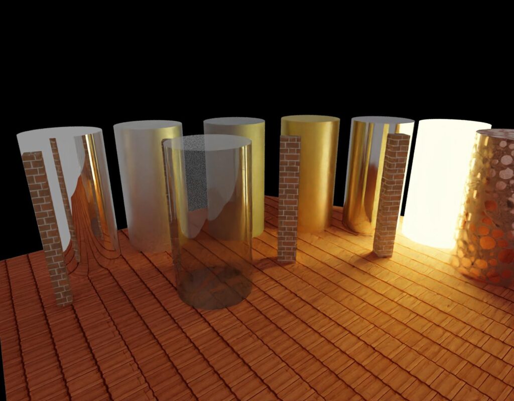 Nella figura sottostante sono presenti dei cilindri in vari materiali: argento a specchio, argento satinato, alluminio, oro satinato, comò, rame e vetro sottile. E’ presente inoltre il materiale Luminous, che emette luce